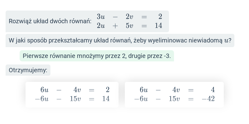Ćwiczenie polega na uzupełnieniu poszczególnych kroków składających się na dłuższe zadanie, takie jak np. upraszczanie wyrażeń lub rozwiązywanie równań. Ćwiczenie stanowi idealną rozgrzewkę przed samodzielnym rozwiązywaniem całych przykładów.